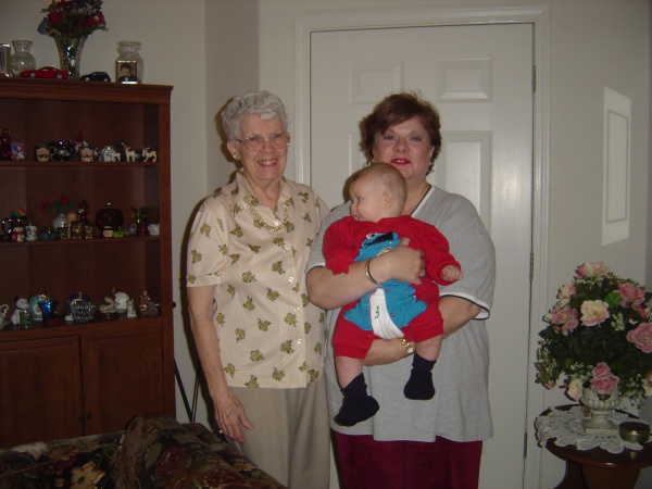 Grandma Diana holds baby while Great-Grandma Bennie looks on, and Donovan wonders whether the stuff in that cabinet is as fragile as it looks.