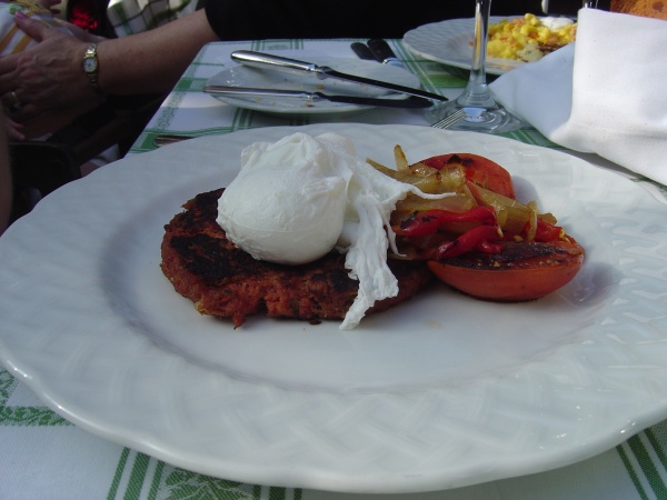Matt's rock-solid poached egg atop some kind of corned-beef hash thing.