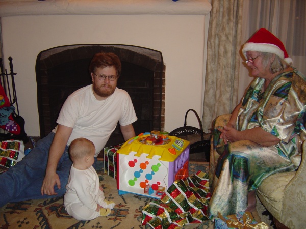 Daddy looks at camera. Bobbie looks at Donovan. Donovan looks at toy. Toy thinks, "Oh, no. not again."