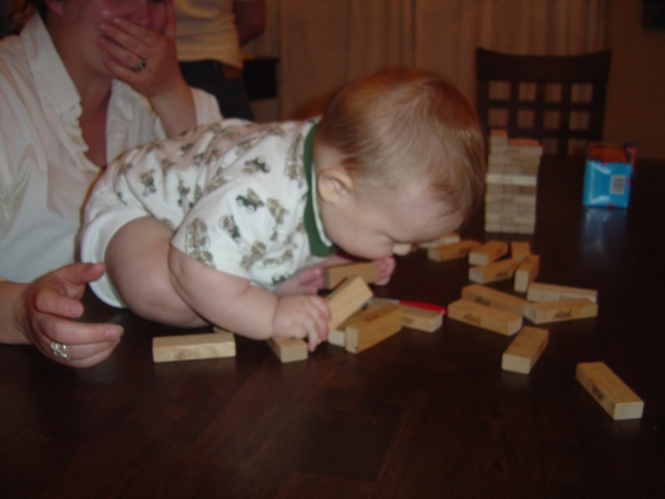Jenga! At Adam and Donna's. Mommy is trying hard not to laugh too loud, as it might distract the baby from his highly amusing play.