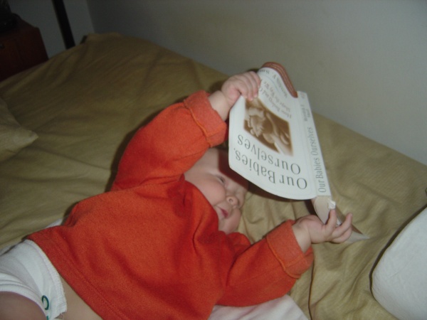Hmmm... Mommy's book is pretty good! I wonder why she reads it upside down though.