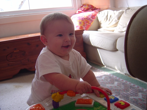Donovan plays with a fun toy at Robin's house for an