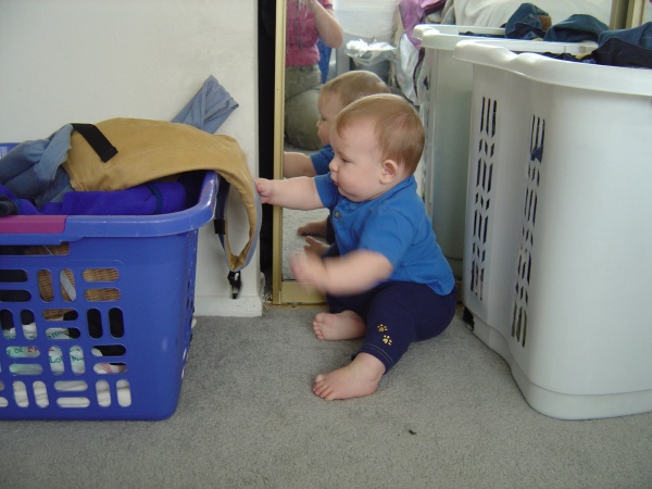Donovan tries to figure out how to put on the Ergo carrier all by himself.