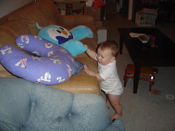 Donovan can't decide which will be more fun to play with -- the giant Bruce pillow, or the Boppy.