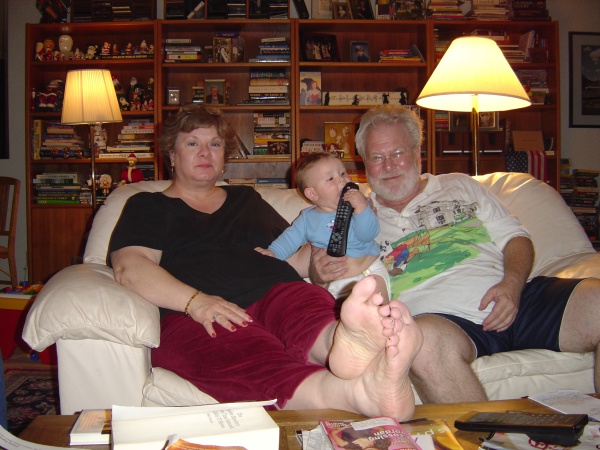 Grandma Diana and Grandpa Lanny provide a safety boundary while Donovan enjoys the remote.