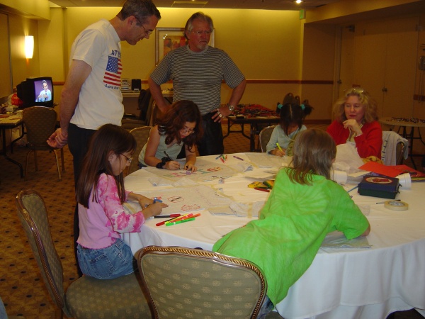 The kids work on t-shirts while the adults look on. From left to right: Jon Nelson, Nadia Wright, Dixie Wright, Fred Durlitzer, Mulan Sweeney, Cole Pavelchek, Elaine Nelson.