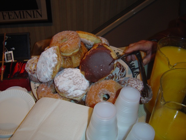 Comments: The continental breakfast at the Broadway Inn, Manhattan. Monica couldn't eat any of the food (since we recently discovered that Donovan has a wheat sensitivity), but the orange juice was great.