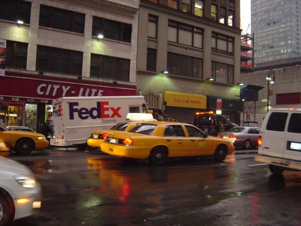 Hard to tell amidst the taxi cabs, but that's a FedEx truck being towed.