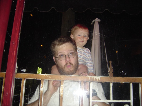 Daddy is astonished to find an infant sitting on his shoulders.