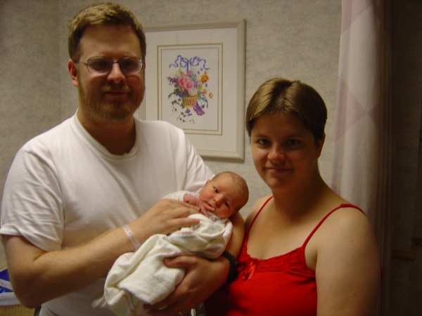 Mommy, Daddy, and Donovan pose for a poorly-lit photo.