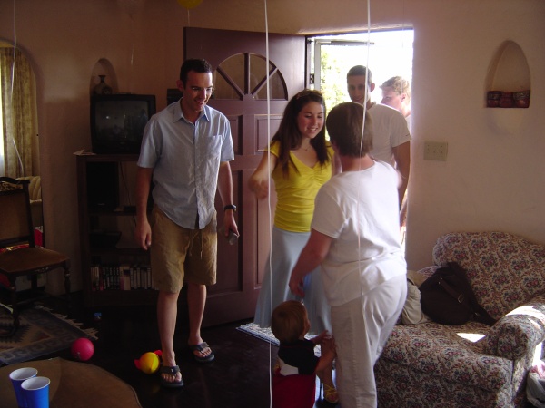 Monica greets guests Avital, Tim, Jeremy, and Greg.