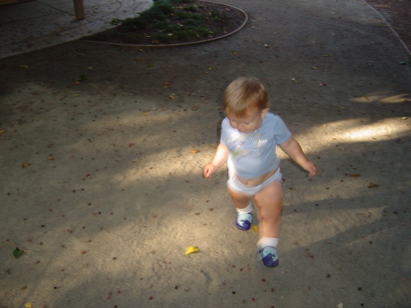 Color-coordinated boy strolls through the park.