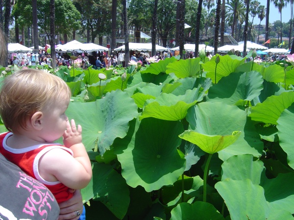 Baby, now awake, wonders if lotus is good to eat. (The roots are, actually!)