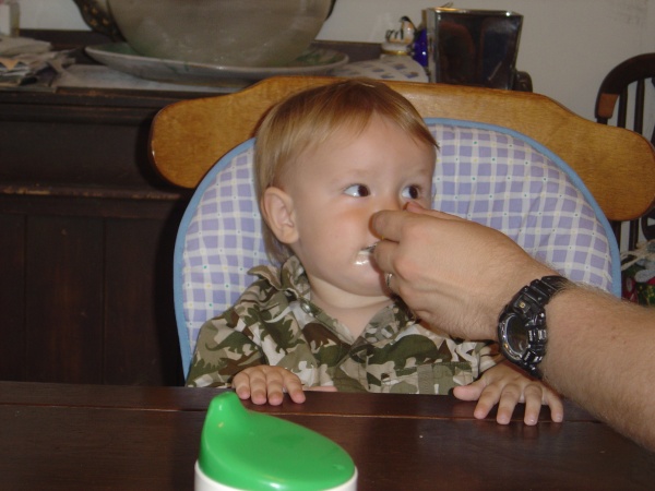 He likes this yogurt we got him, although he tends to let it dribble down his chin.