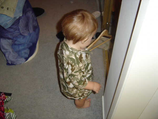 Donovan plays with a wooden clothes hanger. He likes them because they make loud banging noises when he hits things with them!