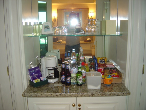Comments: The fully-stocked minibar. All that crap is ludicrously expensive, so we didn't take any of it. We did pull a bunch of stuff out of the fridge in order to put our own food in there, but we put it all back before we left. Taken: Saturday, October 8th, 2005 at 13:23:07 Pacific