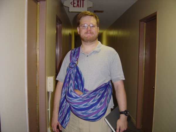 Daddy carries Donovan in a Maya Wrap sling. Baby is asleep.