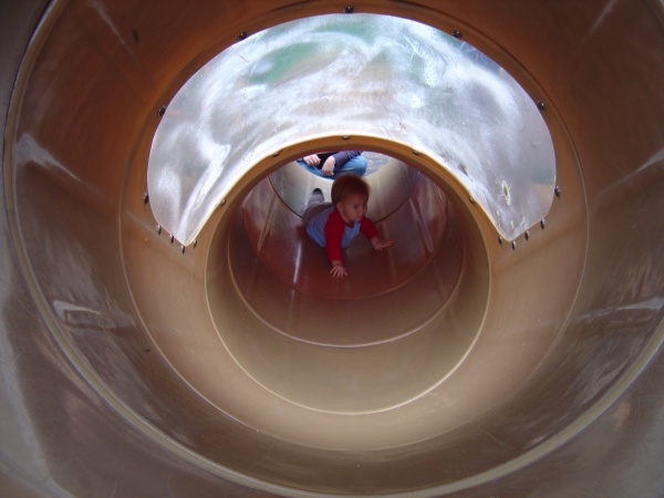 Donovan climbs down the giant tube, backwards.