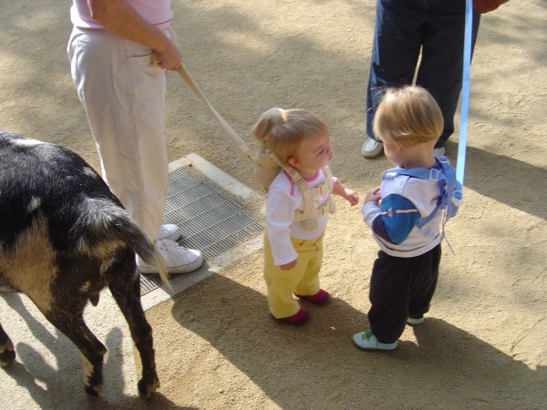 The irony: humans on leashes while goats roam free. You can bet the goats are laughing.