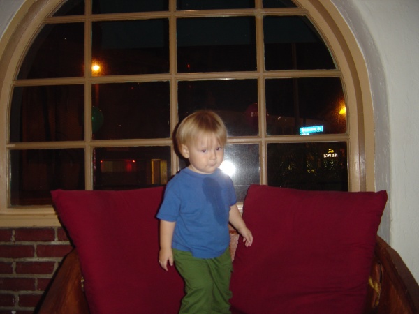 Comments: Donovan at Acapulco on Sunset (near Hollywood High). He climbed up on these lobby seats all by himself! He also spilled water down his shirt all by himself... but he's been good at that for a while now.