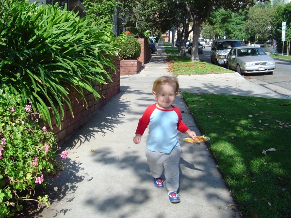 Donovan found some trash (a flyer no one seemed to want) on the front porch, and carried it all the way to the trash can around the corner on Santa Monica Bl. Yay! Trash!