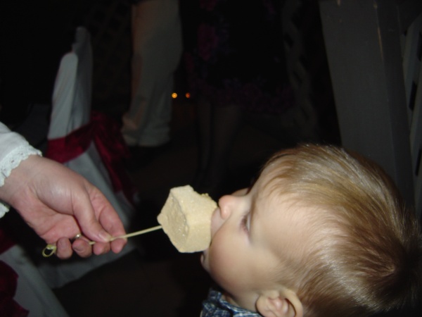Donovan greatly enjoyed the gigantic marshmallows from the dessert table. He ate almost a third of one by himself!