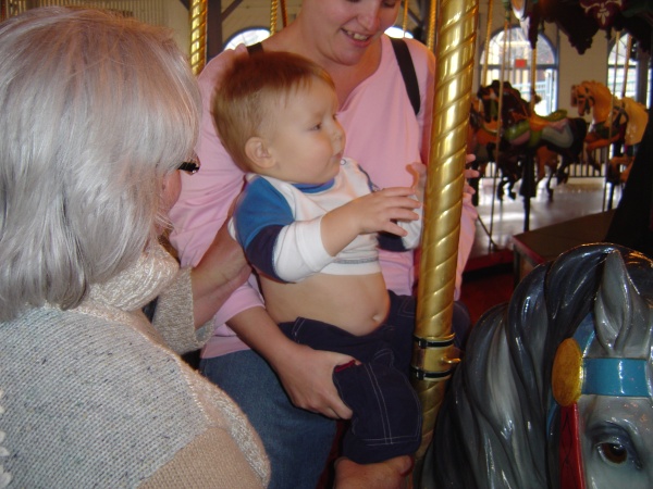 Yay! The carousel is open! Oma helps the boy onto a horse with Mommy.