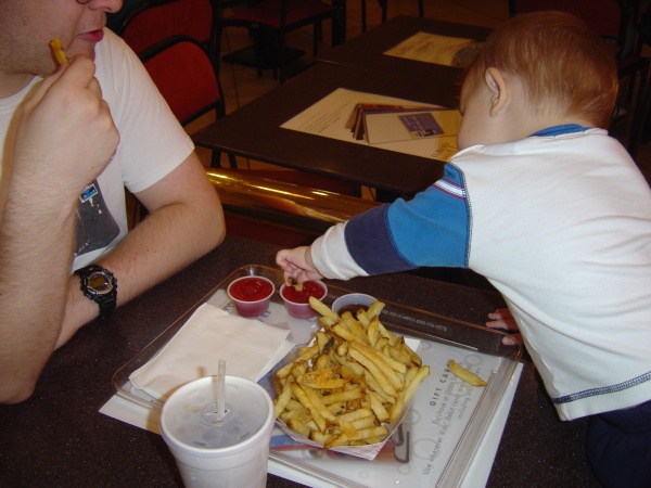 Donovan dips fries in ketchup. Mmm!