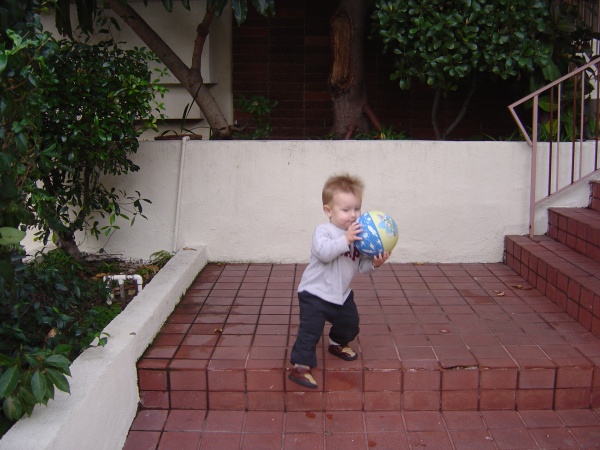 Donovan tries to eat his basketball as he climbs down the stairs.