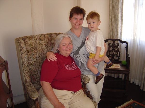 A posed photo of three generations (Oma, Mommy, and... some other guy).