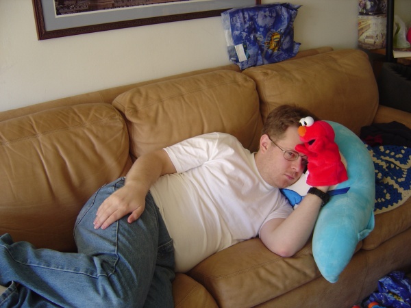 Daddy notices Elmo looks like he's about to have a daddy-belly snack.