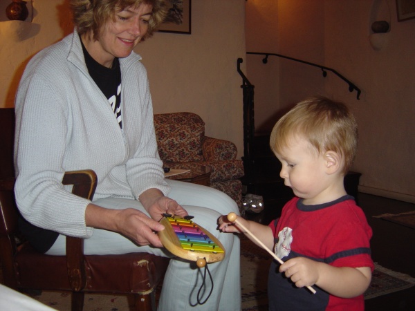 Miké (pron. Mika) visited from Germany and brought Donovan a real (toy) glockenschpiel. It's shaped like a mouse, too, just for fun.