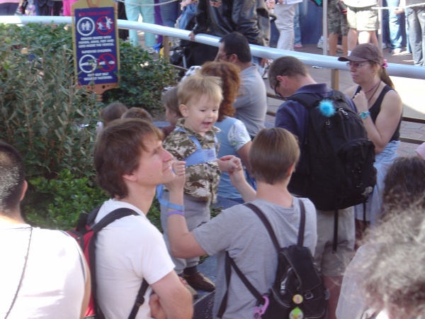 Comments: Mommy keeps Donovan amused while waiting (forever!) in line for the Rocket Ships by helping him "jump" off the wall. (Seriously, Beric and Matt went on Star Tours and *still* had to wait 15 minutes for us!) Taken: Friday, February 24th, 2006 at 11:10:59 Pacific