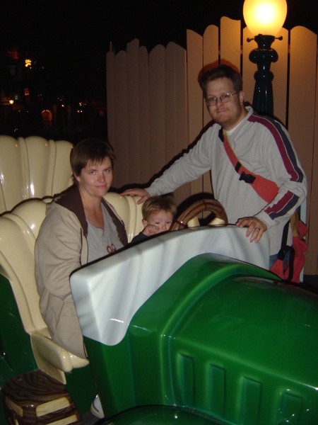 Comments: A teary-eyed boy poses in a toon car in Toontown. A few minutes earlier, he fell out of said car, and cried a great deal before suddenly stopping and saying, "Cars? Cars?" because he wanted to spin the wheel again. Taken: Friday, February 24th, 2006 at 16:59:29 Pacific