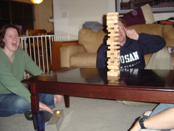Miles and Sarah cackle madly at the impending Jenga topple.