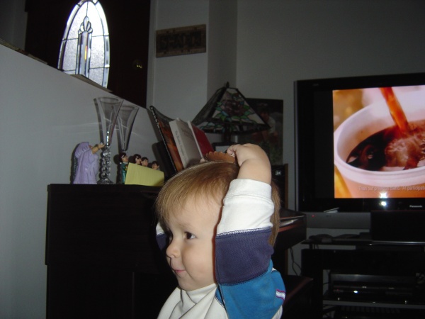 Comments: Donovan attempts to wear a tiny cowboy hat at Joel's. ("Hat!") In the background, at original resolution, you can actually read the fine-print disclaimer at the bottom of the TV screen. Yes, we all envy Joel's plasma high-def owniness.