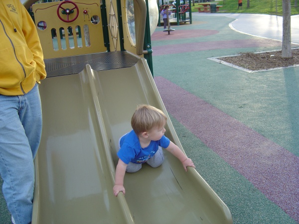 Donovan climbs down the slide. Sliding up didn't work so well.