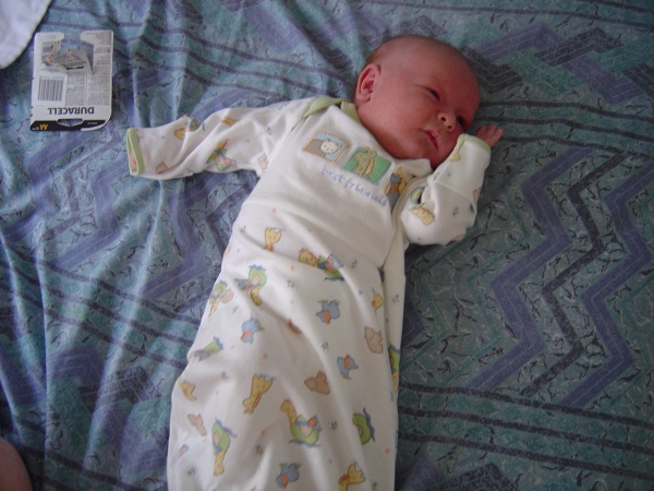 Donovan's nightgown is convenient because it keeps him warm, and it has an elastic hole at the bottom so that it's easy to change his diaper.