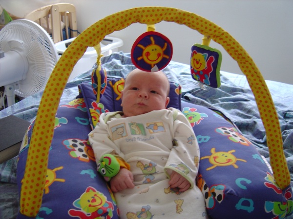 Play! Well, he doesn't really play yet, he just sits there and flails his limbs.