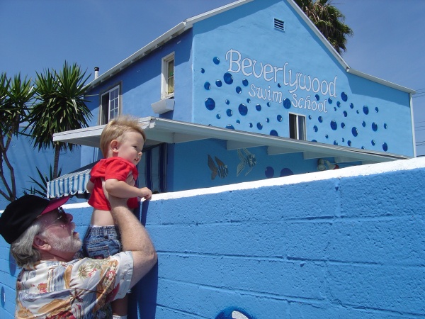 Papa gives Donovan a peek at the swim school that Daddy used to attend.