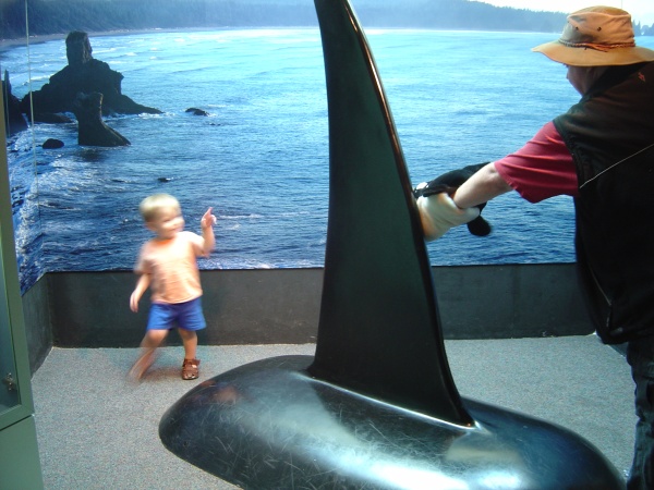 Brad amuses Donovan with an orca hand puppet. (No, this isn't in the gift shop... they just had hand puppets and dress-up stuff available in strategic locations throughout the aquarium.)