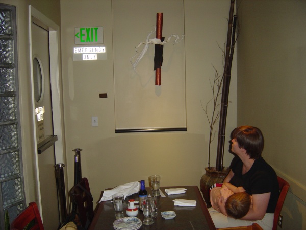 Monica contemplates the convenient emergency exit while Donovan has a before-sushi snack at Kirala in Berkeley (recommended by a friendly Whole Foods cashier).