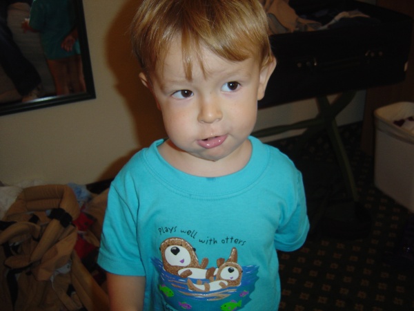 Donovan contemplates whatever he's chewing on in the hotel room. The t-shirt he's wearing is from the Seattle Aquarium (see