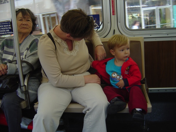 Mommy helps Donovan remove his jacket now that we're on the bus. (You know you're in San Francisco when you're wearing a jacket in June, and it's the Northern Hemisphere.)