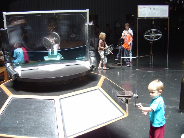 When you turn the crank, the liquid-filled panel spins around, forming a parabola in the surface of the liquid. (Toddler version: This crank turns! Cool!)