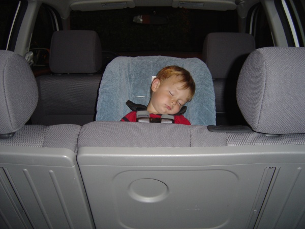 Donovan asleep in the back of a Toyota Matrix. (Which is a nice little car, but the dashboard is incredibly annoying.)