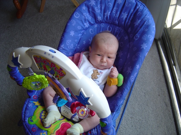 Donovan warily regards the Kick 'n' Play toy bar.