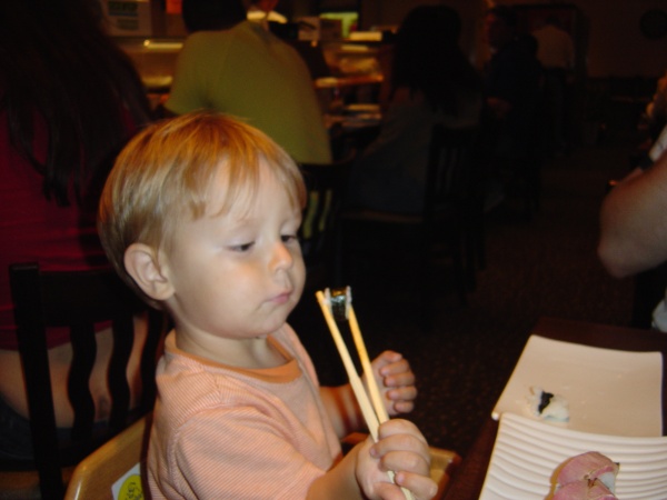 Hey, he's actually holding the sushi roll between the chopsticks! Yay!