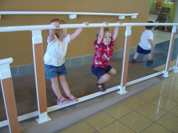 Donovan had a great deal of fun swinging on the railing with this little girl.