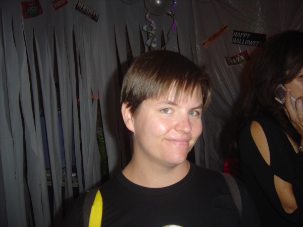 Mommy poses for a shot against the entrance to some haunted something-or-other.